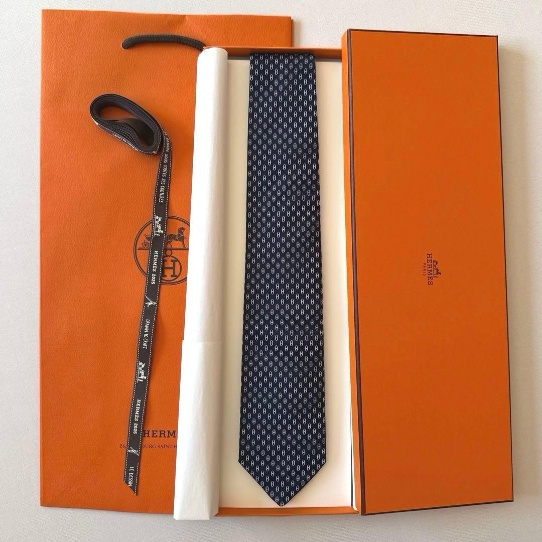 【極美品】HERMES ネイビー 幾何学模様 ネクタイ 美品 HERMES エルメス ネイビー 紺 白チェーン幾何学模様 シルク