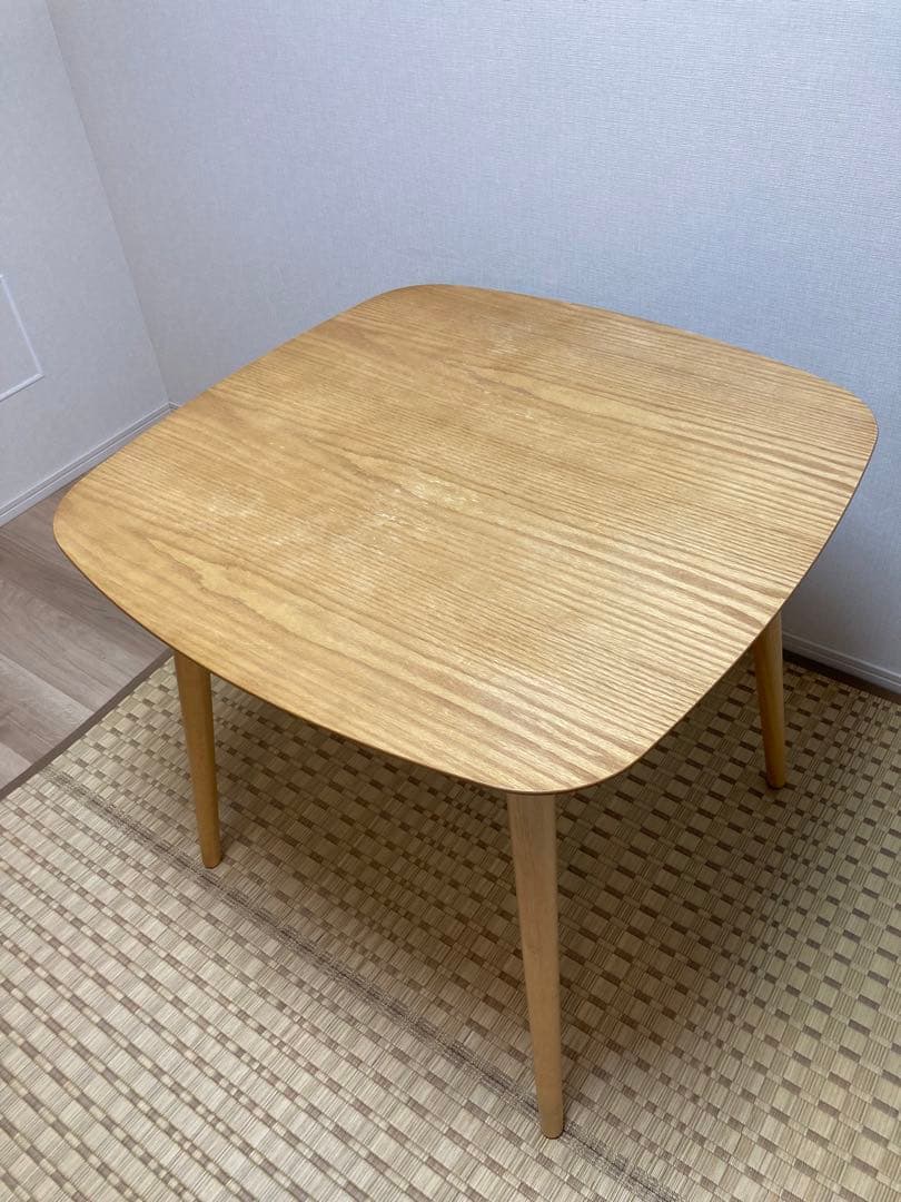 - 念願の角の無いテーブル・・円形を置くには狭いダイニングなのでずっと探してました。色合い、手触り申し分なく素敵です・・大満足です。脚が少し奥についてるのもいいですね。このテーブルの傍が私の居場所になる事間違いなしです。